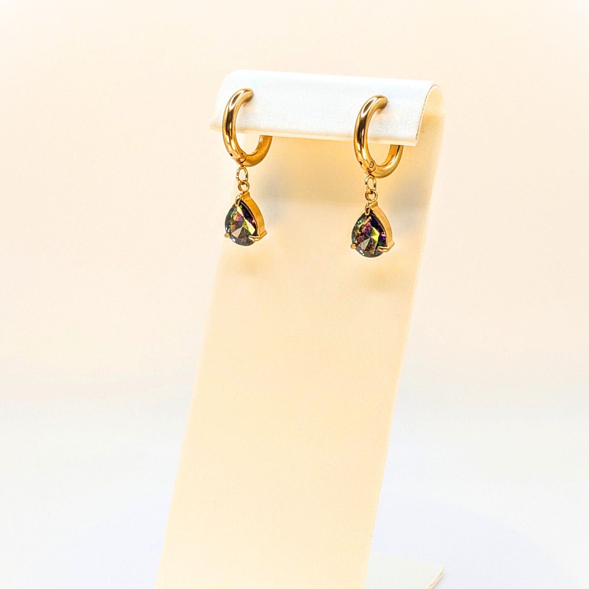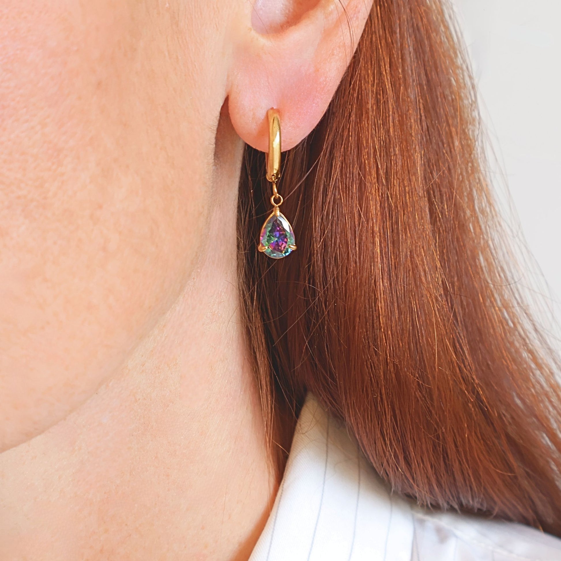 Les boucles d’oreilles Iris reprennent le pendentif iconique du collier du même nom. Serties de zircon multicolore, elles captent la lumière à chaque mouvement. Un design vibrant et lumineux à porter seul ou en parure avec le collier Iris.
