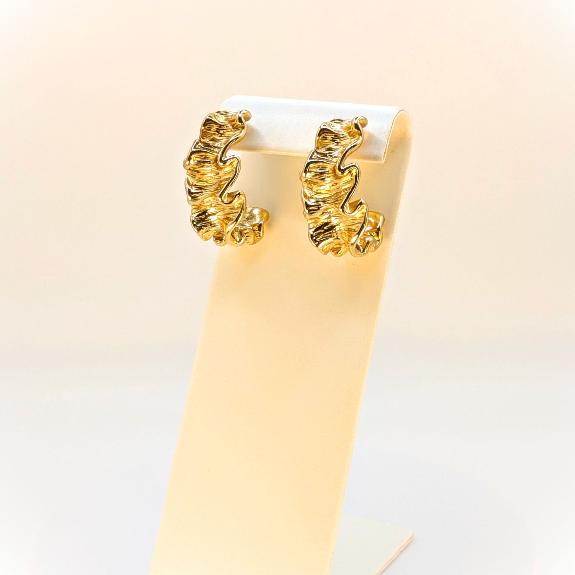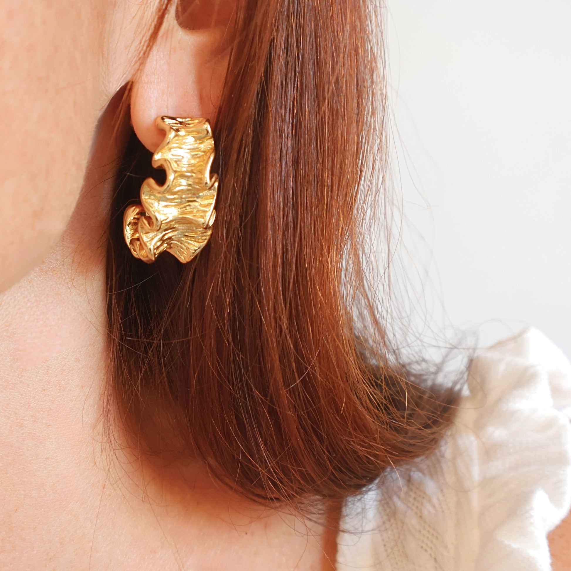 Les boucles d'oreilles Kaïa séduisent par leur forme demi anneau large et leur texture chiffonnée ultra tendance. Dorées, audacieuses et résolument mode, elles apportent caractère et éclat à tous vos looks.