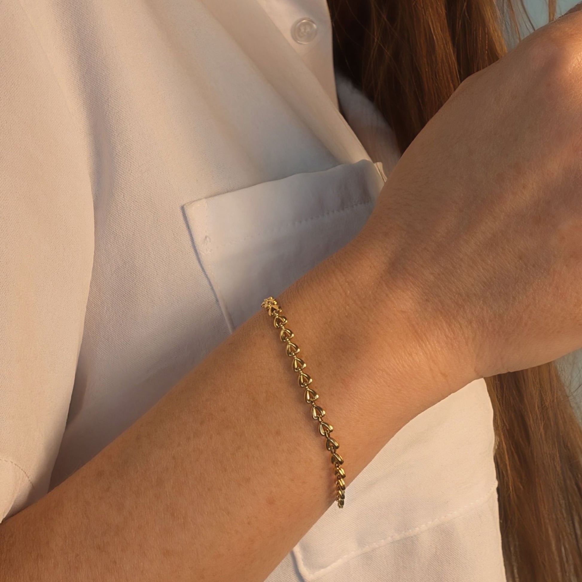 Le bracelet Amara capture la douceur de l’amour avec ses petits cœurs dorés délicatement alignés. Léger, raffiné et résolument romantique, il se porte aussi bien seul qu’en superposition.