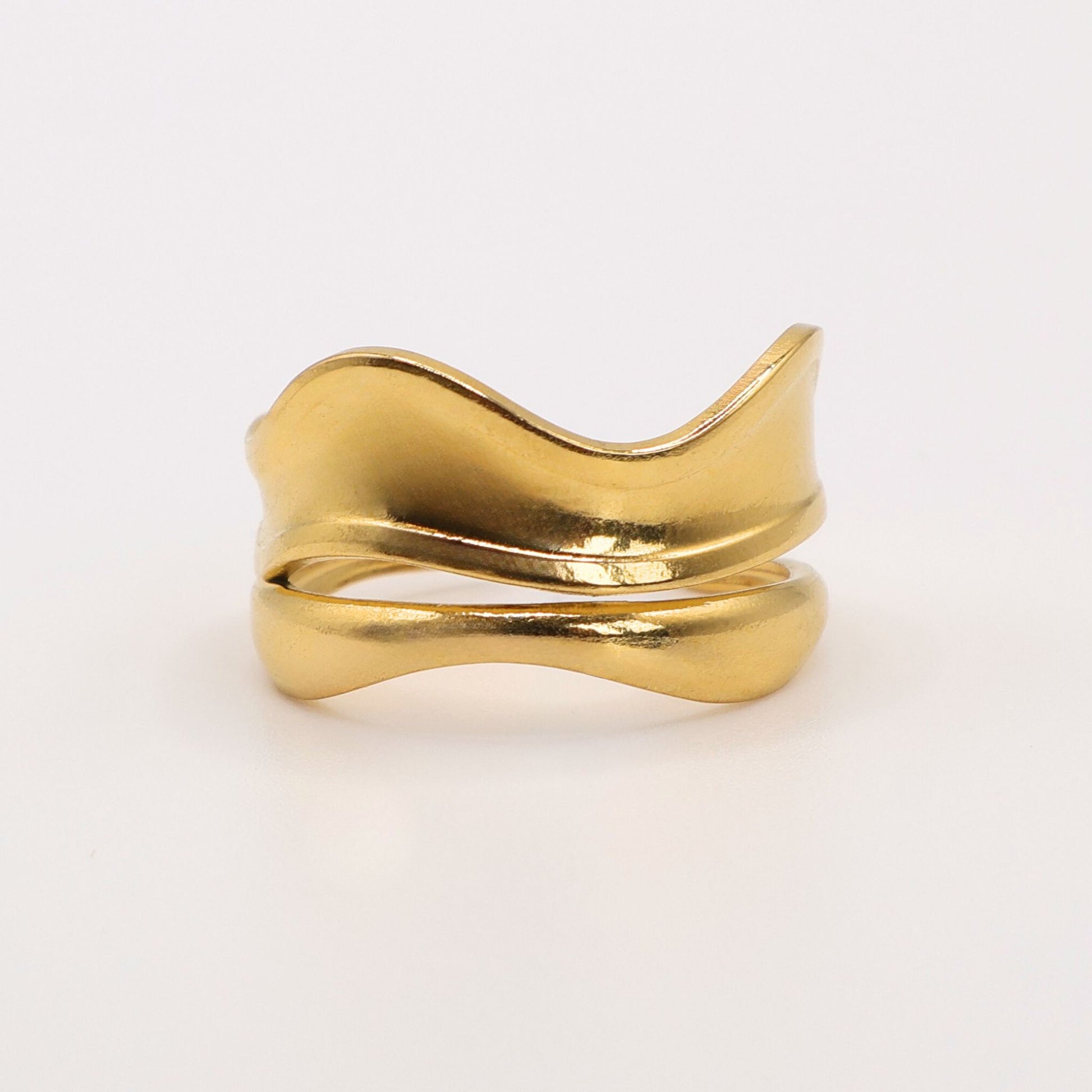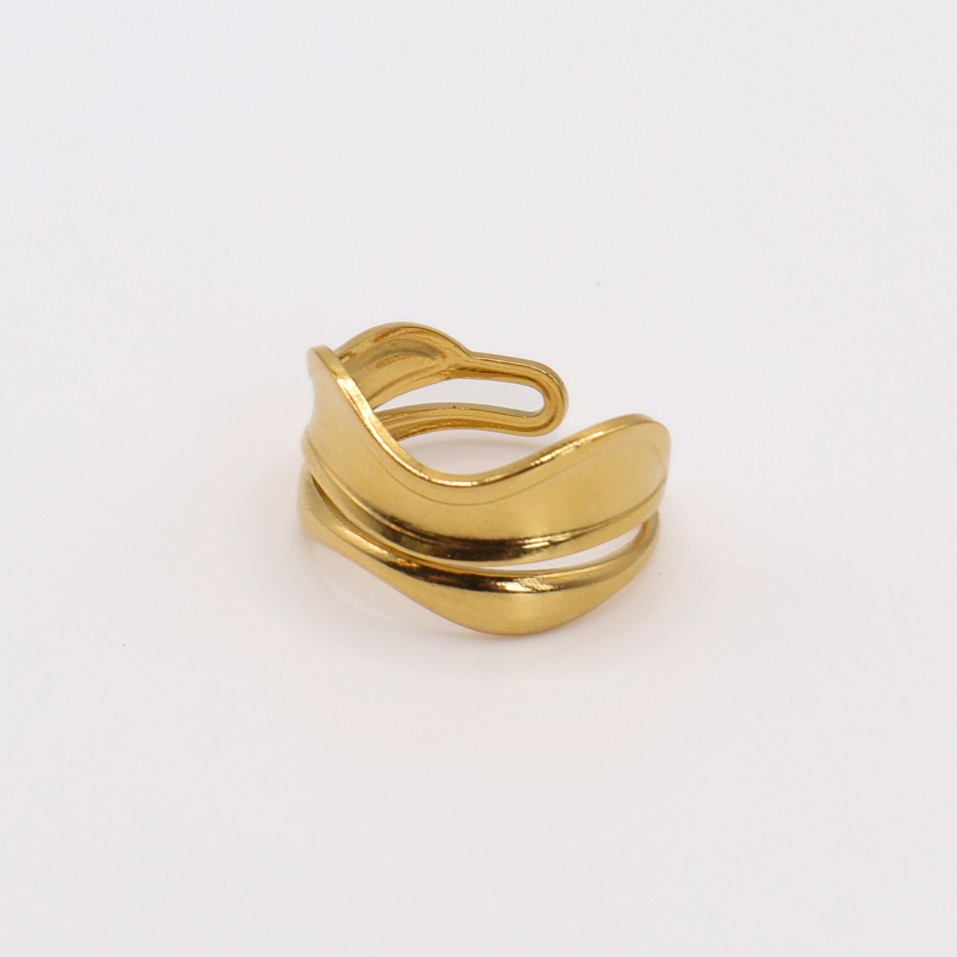 La bague Calia se distingue par sa silhouette sculpturale et sa brillance dorée.