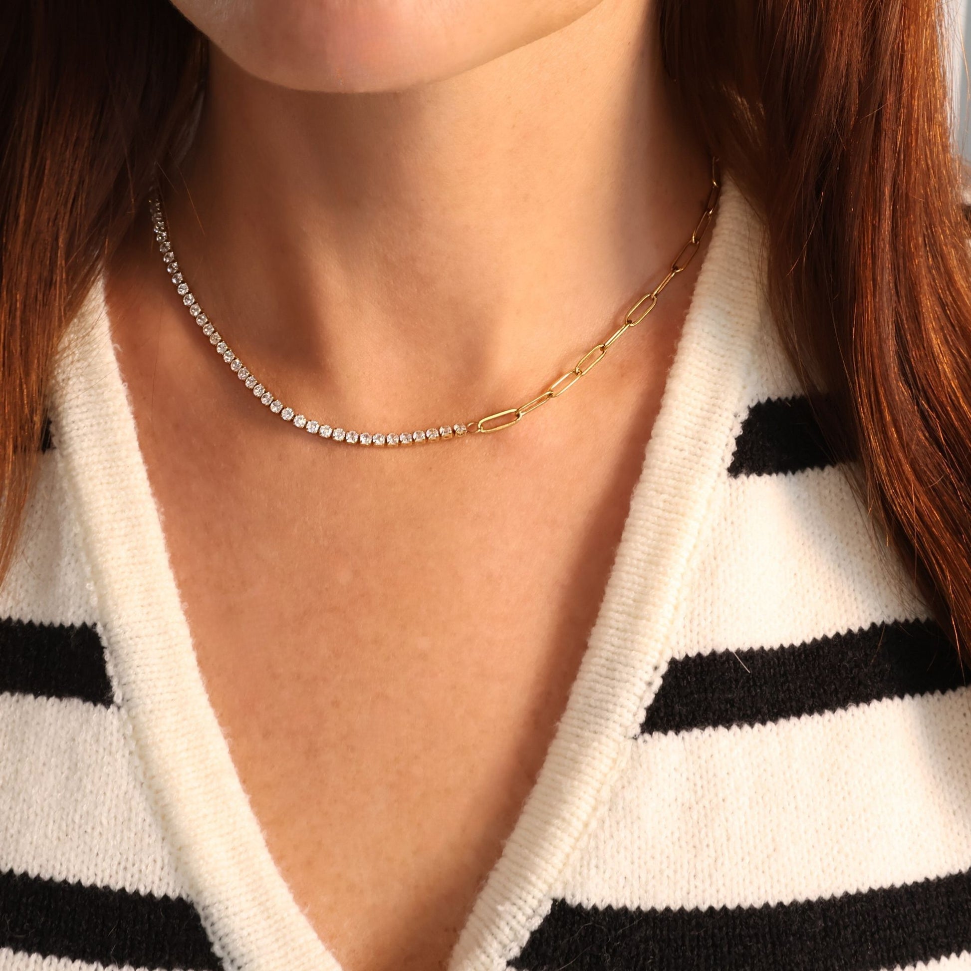 Ce collier doré incarne l’équilibre parfait entre éclat et modernité. D’un côté, une délicate rangée de zircons scintillants, de l’autre, des maillons rectangulaires minimalistes. Le collier Calista s’adapte à toutes les occasions, un bijou raffiné à porter seul ou en superposition.