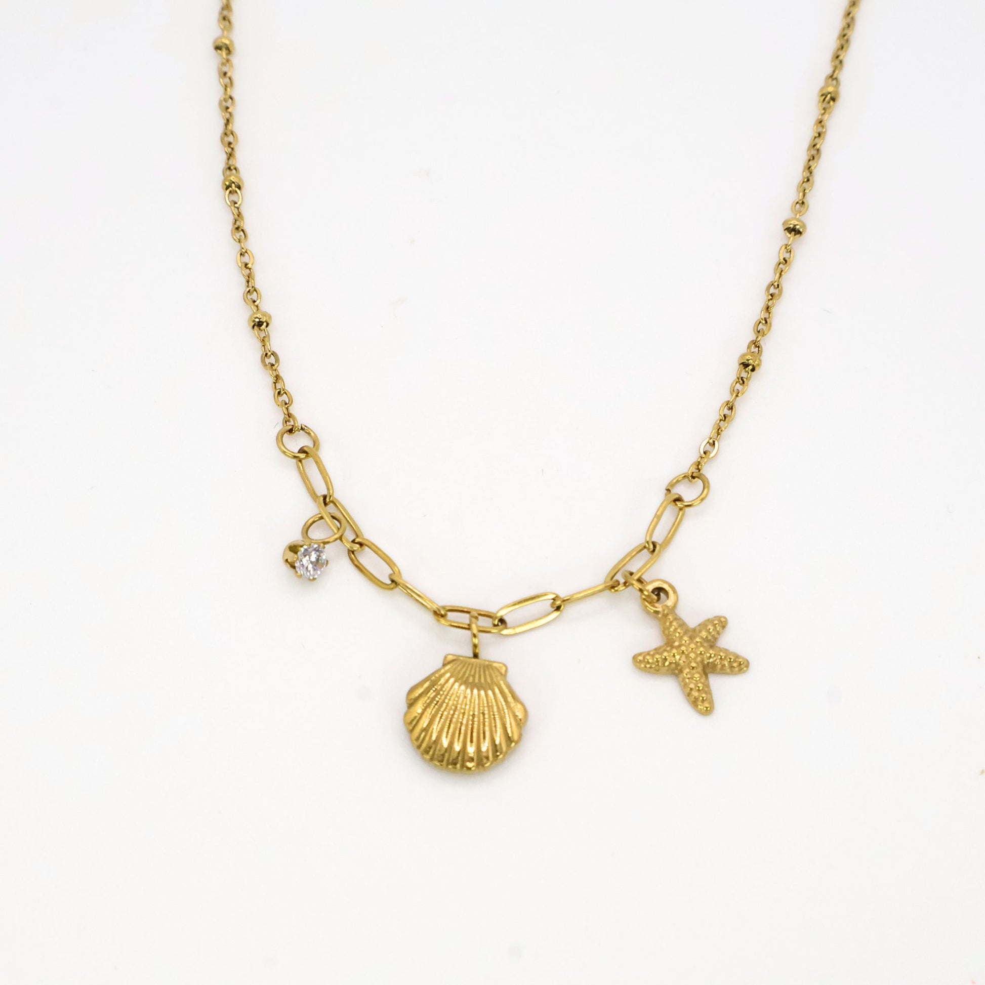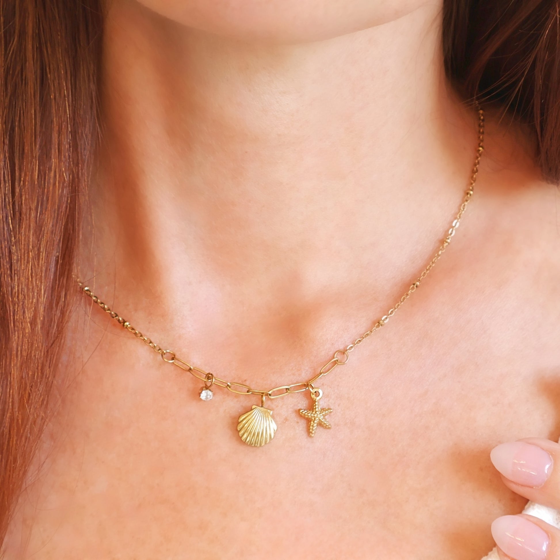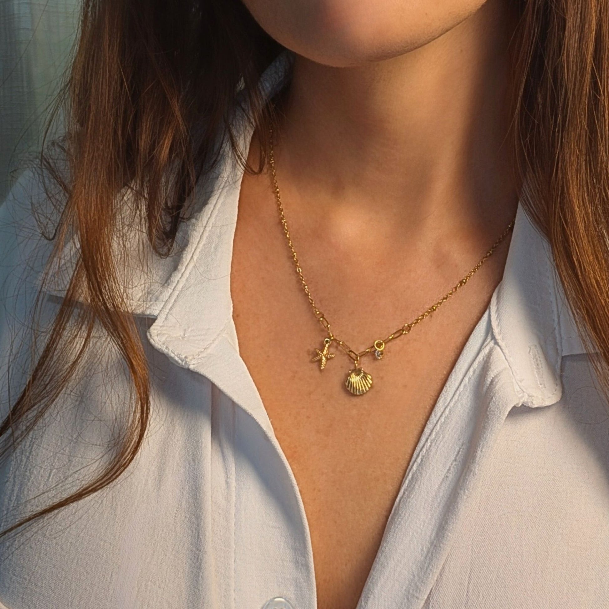 Le Collier Oceana vous transporte en bord de mer avec ses trois pendentifs dorés — étoiles de mer et coquillage — rehaussés d'un zircon scintillant. Raffiné et intemporel, il sublime vos tenues du quotidien à vos escapades ensoleillées.
